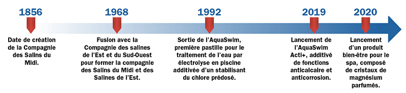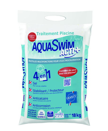 Salins a été une entreprise pionnière en étant le premier acteur du sel à s’intéresser au marché de la piscine à la fin des années 80 quand les systèmes d’électrolyse se sont développés. C’est en effet en 1992 que nous avons lancé une innovation majeure : AquaSwim. Ce véritable produit de traitement est le porte-drapeau de notre gamme de sels pour piscine et a fait l’objet d’un brevet. Depuis, la gamme s’est élargie avec des produits 2 en 1, puis 3 en 1 et enfin 4 en 1 avec une fonction sel, un stabilisant pour prolonger la durée de vie de l’électrochlorateur, une action anticalcaire et une action anticorrosion pour protéger les parties métalliques de la piscine : l’AquaSwim Acti+.