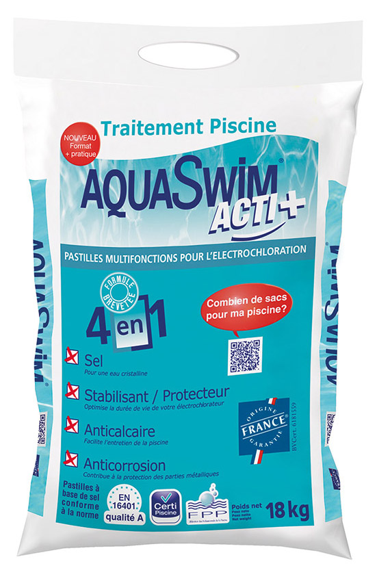 Salins a été une entreprise pionnière en étant le premier acteur du sel à s’intéresser au marché de la piscine à la fin des années 80 quand les systèmes d’électrolyse se sont développés. C’est en effet en 1992 que nous avons lancé une innovation majeure : AquaSwim. Ce véritable produit de traitement est le porte-drapeau de notre gamme de sels pour piscine et a fait l’objet d’un brevet. Depuis, la gamme s’est élargie avec des produits 2 en 1, puis 3 en 1 et enfin 4 en 1 avec une fonction sel, un stabilisant pour prolonger la durée de vie de l’électrochlorateur, une action anticalcaire et une action anticorrosion pour protéger les parties métalliques de la piscine : l’AquaSwim Acti+.