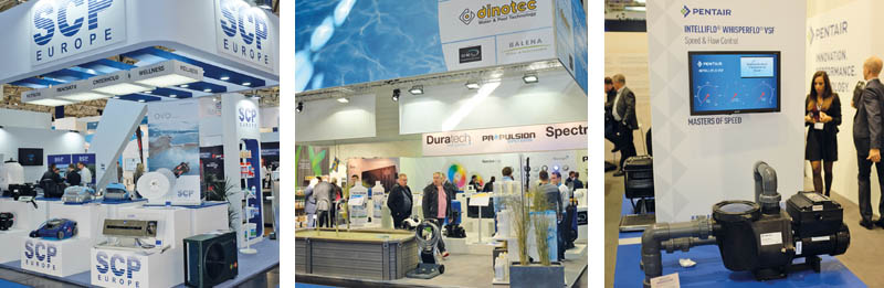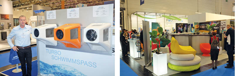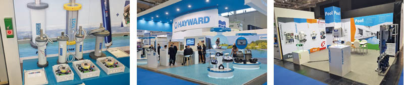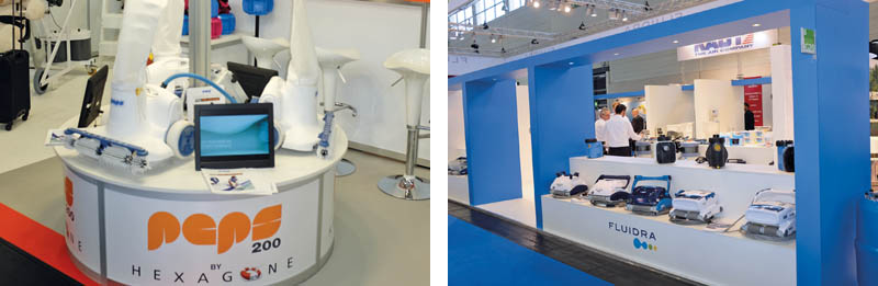 Sur le stand du groupe Zodiac, qui possède une filiale en Allemagne, plusieurs nouveautés : le robot nettoyeur connecté RV 5480 IQ, le module IQPump et l’électrolyseur Tri Expert Low Salt fonctionnant avec seulement 2 g/l de sel. (Droite)