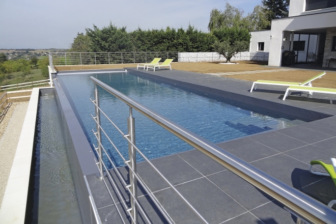 C’est en 2006, lors du salon de Lyon, que les 2 anciens élèves de Pierrelatte se retrouvent. C’est le coup de foudre qui donne naissance, en 2008, à un petit garçon et à la SARL Patrick Bessy. Côté construction, ils réalisent chaque année environ 25 piscines familiales traditionnelles avec étanchéité membrane armée, dans un rayon de 50 à 60 km autour de l’entreprise. « Difficile de donner un budget moyen pour nos réalisations, précise Patrick. Notre objectif est de cerner précisément les besoins et les souhaits de nos clients et de leur apporter un service maximum. J’avoue que j’aime bien les projets très élaborés comme les bassins suspendus. Pour les équipements, nous installons fréquemment une régulation pH et une régulation chlore ainsi qu’une déchloramination des eaux de rejet. Une autre part importante de notre activité est la rénovation. Il est vrai que la famille Bessy construit des piscines depuis plus de 37 ans ! Dernièrement nous avons réalisé une rénovation intégrant le redimensionnement, fond compris, d’une grande piscine. Enfin notre région, le Beaujolais, est riche en résidences secondaires, dont certaines sont la propriété de clients étrangers, ce qui signifie pour nous une activité entretien importante. »