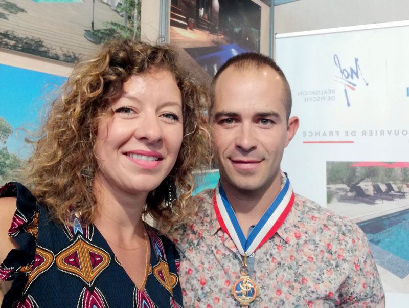 « Depuis ma sortie du centre de formation de Pierrelatte en 2008, je suis resté en contact avec son équipe enseignante et je participe régulièrement, en tant qu’examinateur, aux épreuves du BP. C’est ainsi que m’est venue l’idée de participer au concours MOF dans la catégorie réalisation de piscines. En 2017, je souhaitais réaliser une piscine d’exposition qui mettrait en valeur l’expertise de l’entreprise. J’ai alors pensé qu’elle serait le projet idéal à présenter au concours MOF et qu’elle me permettrait également d’avoir, point important pour moi, un retour sans concession, de la part de professionnels aguerris, de mon savoir-faire. C’est ainsi que je me suis lancé dans le concours MOF sans vraiment me rendre compte, je dois bien le reconnaître, de la somme de travail que cela allait représenter. Sur 8 inscrits en 2017, j’ai fait partie des 2 sélectionnés. La préparation du dossier de présentation d’une piscine devant s’intégrer dans son environnement a été un gros travail avec la rédaction de près de 300 pages que j’ai pu mener à bien avec le soutien efficace de ma compagne Elsa. La réalisation du bassin, que j’ai terminé le 27 octobre 2018, m’a demandé 2 mois complets de travail non-stop. Ce fut une belle et très enrichissante expérience et une période durant laquelle j’ai connu des doutes, des moments de découragement et des périodes d’enthousiasme. Je suis aujourd’hui très fier de mon titre de MOF et me souviens avec émotion de la remise de la “cravate” à la Sorbonne ainsi que de la réception qui a suivi au Palais de l’Élysée. Enfin le titre de MOF représente une fantastique carte de visite pour mon entreprise ».