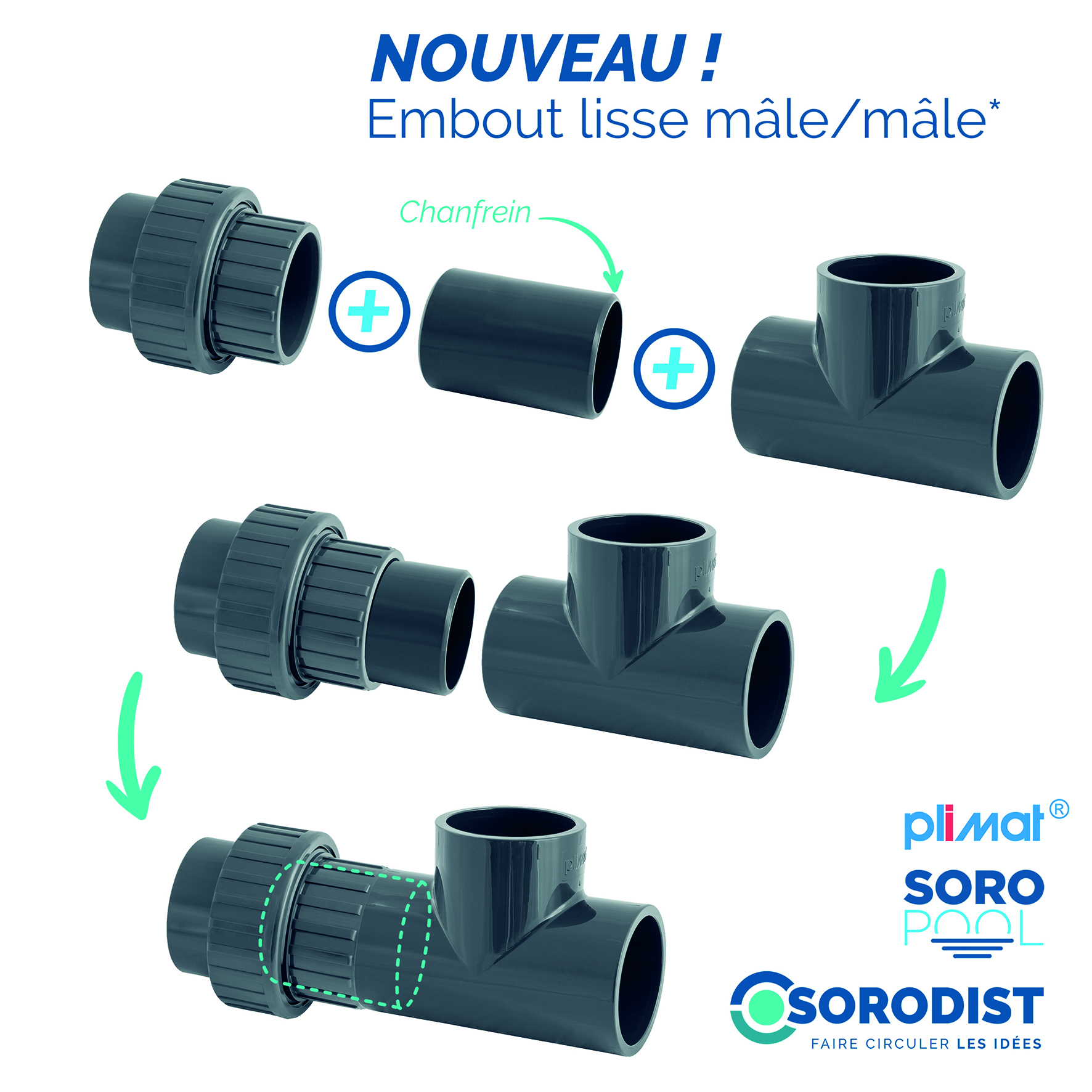 En collaboration avec son usine partenaire PLIMAT, Sorodist a développé un nouveau produit destiné aux professionnels de la piscine pour leur permettre de gagner du temps sur les chantiers : un embout lisse mâle à coller.