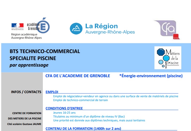 Un BTS technico-commercial par apprentissage, spécialité piscine, vient d’ouvrir au CFA de Pierrelatte (26). Il s’adresse aux jeunes de 16 à 25 ans, titulaires d’un diplôme de niveau IV (Bac), et propose une formation leur permettant de devenir technico-commerciaux de terrain et/ou négociateurs-vendeurs en agence ou dans une surface de vente de matériel de piscine.
