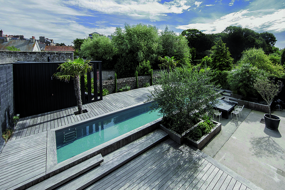 Étendue le long de la façade arrière de l’ancienne miroiterie de 350 m2, la piscine en couloir de nage a étiré au maximum ses lignes d’un bout à l’autre du terrain. Le ton est donné : ici, on nage. Il n’y a donc pas d’escalier pour accéder au bassin mais juste une échelle immergée sans aucune crosse. Ce choix permet de faciliter le passage du volet roulant et ne pas empiéter sur le design du bassin. Les végétaux ont été choisis avec soin. Tantôt volumineux pour effacer un vis-à-vis un peu trop présent ; tantôt élancés pour créer du volume, des formes graphiques le long du mur de pierre en bout de terrain.