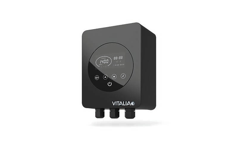 Vitalia VS se branche simplement sur une prise murale, la pompe étant raccordée elle aussi par une prise. Ce variateur de fréquence module l’intensité électrique fournie à la pompe pour augmenter ou réduire la vitesse de rotation de l’appareil. A faible puissance, la réduction potentielle de la consommation électrique pourrait atteindre 63 % et s’accompagner d’une baisse de 30 % du volume sonore, selon le fabricant. La consommation électrique instantanée s’affiche d’ailleurs sur l’écran tactile du régulateur.