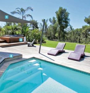 Le spa est une alternative judicieuse pour profiter de l’eau toute l’année. Déporté face à la chambre des parents pour en favoriser l’accès direct, cet îlot de bien-être s’entoure d’une barrière végétale aux accents tropicaux qui le met à l’abri des regards. Pour veiller à sa parfaite intégration, il est habillé d’ipé, le même bois que la terrasse.