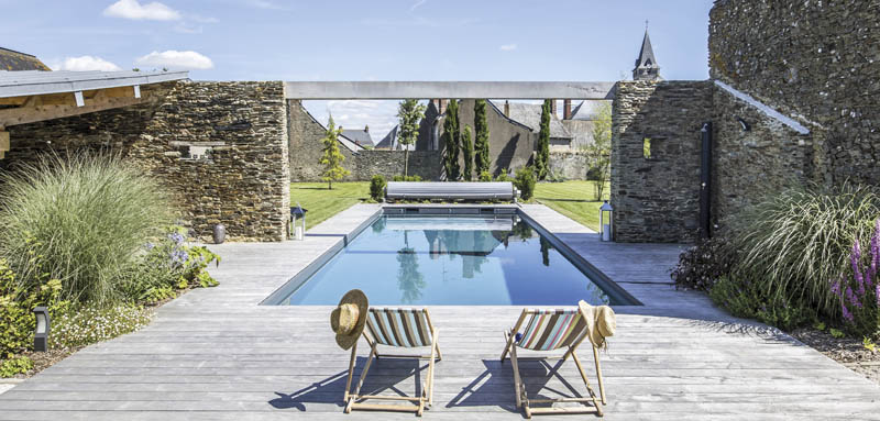 « Même si j’aime à dire que chaque chantier présente des difficultés, précise Stéphane Langereau, celui-ci n’en a pas présenté de particulières. Il est vrai que nous avons l’habitude de ce type de réalisation globale et que nos années d’expérience dans le paysage ont développé chez nous de grandes capacités d’adaptation. Si la durée totale du chantier de réhabilitation de ce corps de ferme s’est déroulée sur près de 2 ans, par tranches successives, la construction de la piscine, incluant également le terrassement et les aménagements, a été effectuée en moins de 3 semaines. Aujourd’hui, les propriétaires sont heureux de cette réalisation et s’y plaisent. »