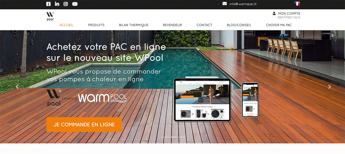 Dans la continuité de son développement, l’entreprise a souhaité axer sa stratégie sur le digital avec la création d’un site associé par domaine d’activité. En avril, le premier site à avoir bénéficié d’une interface repensée est WPool. Anciennement Warmpool, ce site de vente en ligne de pompes à chaleur et déshumidificateurs intègre une page dédiée à la recherche d’un revendeur près de chez soi.