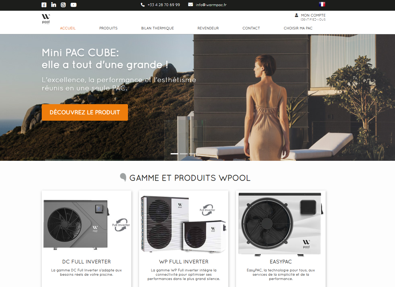 En avril dernier, Warmpac a dévoilé WPool, son nouveau site de vente en ligne de pompes à chaleur et de déshumidificateurs. Ce dernier remplace l’ancienne interface web Warmpool. Ce lancement fait suite à la présentation, en janvier 2021, de la nouvelle charte graphique de la société ayant pour objectif de préciser ses différentes activités : WPool, WPure, WPump et WServices.
