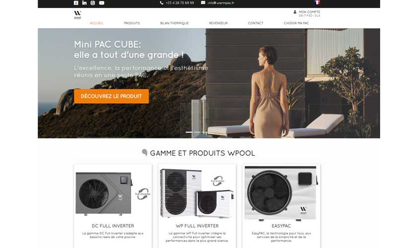 En avril dernier, Warmpac a dévoilé WPool, son nouveau site de vente en ligne de pompes à chaleur et de déshumidificateurs. Ce dernier remplace l’ancienne interface web Warmpool. Ce lancement fait suite à la présentation, en janvier 2021, de la nouvelle charte graphique de la société ayant pour objectif de préciser ses différentes activités : WPool, WPure, WPump et WServices.