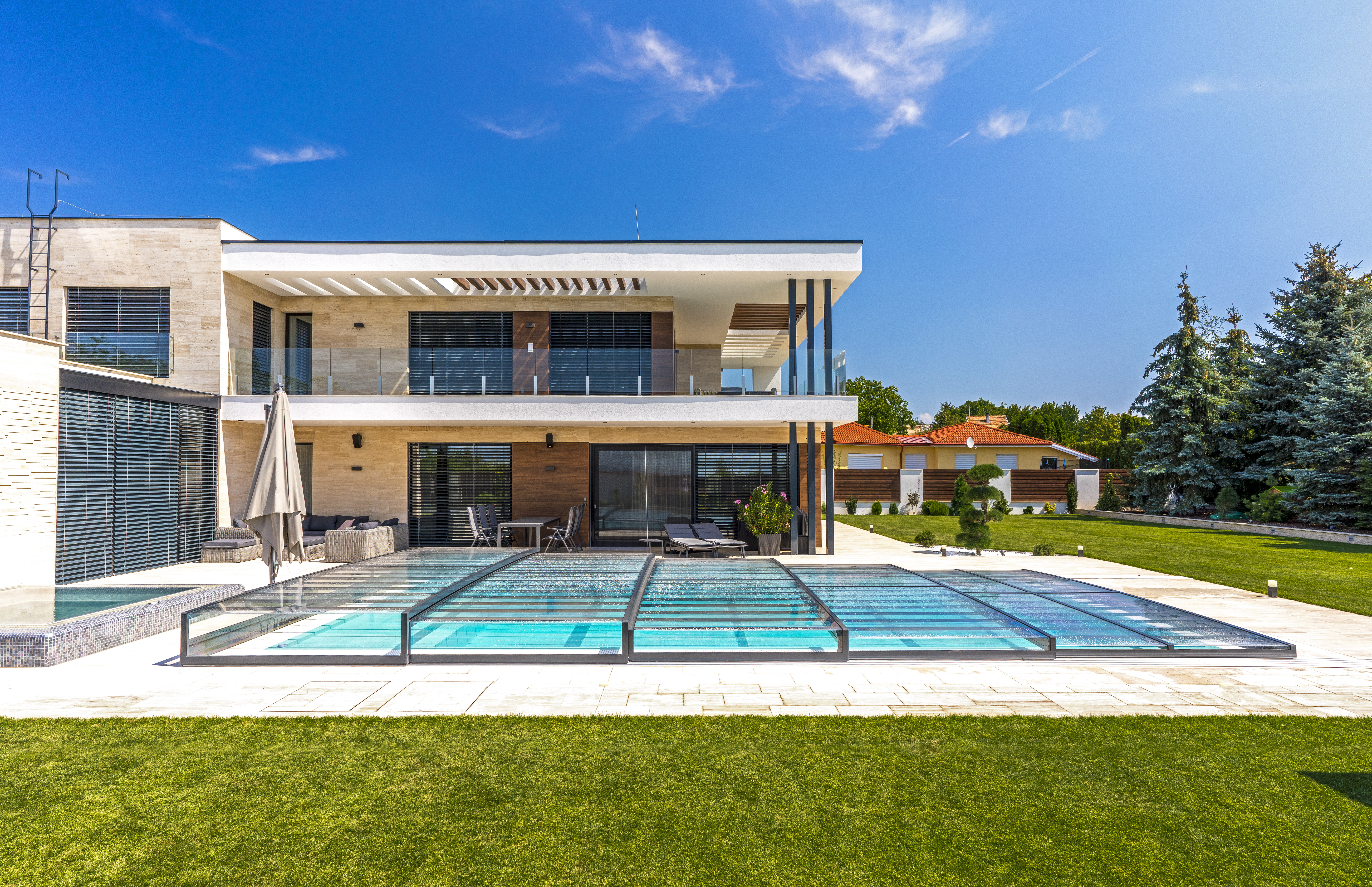 Au design moderne, l’abri Orion pour grandes piscines (jusqu’à 10 m de portée) se décline en deux formes (Orion/Orion 5) et deux épaisseurs de profilé (100mm/160mm). Il peut être commandé en pose libre ou en montage mural, avec une commande motorisée en option.