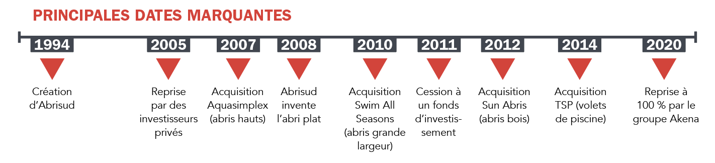 Abrisud a été créée par la famille Chapus en 1994, avant d’être cédée en 2005 à des investisseurs privés, puis rachetée en 2020 par Akena, groupe industriel spécialiste de la véranda.