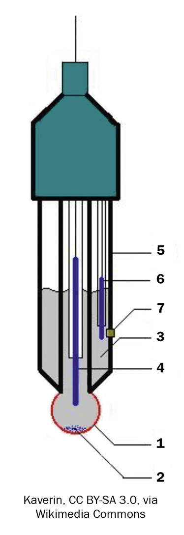 La sonde pH, par exemple, la plus utilisée en piscine privée, mesure la différence de potentiel électrique en mV entre l’électrode de référence (6) en contact avec le fluide via un diaphragme (7) et l’électrode de mesure (4) en contact (2) avec le bulbe microporeux (1). Le lien entre les deux électrodes se fait avec un gel électrolytique (3).