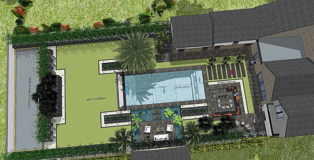 « Je connaissais déjà très bien ce client. Je l’ai rencontré lors d’un premier projet de piscine. Il y a deux ans, j’étais conducteur de travaux pour l’entreprise qui a réalisé son premier bassin, très similaire à celui-ci. Il m’a de nouveau accordé sa confiance pour ce chantier. Il n’a pas demandé de contre devis, nous étions les seuls sollicités. Il souhaitait opérer l’aménagement global de l’extérieur totalement à l’abandon de cette nouvelle maison à rénover, comprenant un jardin, une piscine et un bassin à poissons. Nous lui avons présenté des plans 3D d’une piscine de 12 m x 4,50 m, avec deux profondeurs : 1,30 m et 1,90 m au plus profond. Ces dessins ont été réalisés par un partenaire, Julien Jérôme Thomas, concepteur paysager. Force de proposition, le client a apporté quelques modifications mais les grandes lignes ont été conservées. »