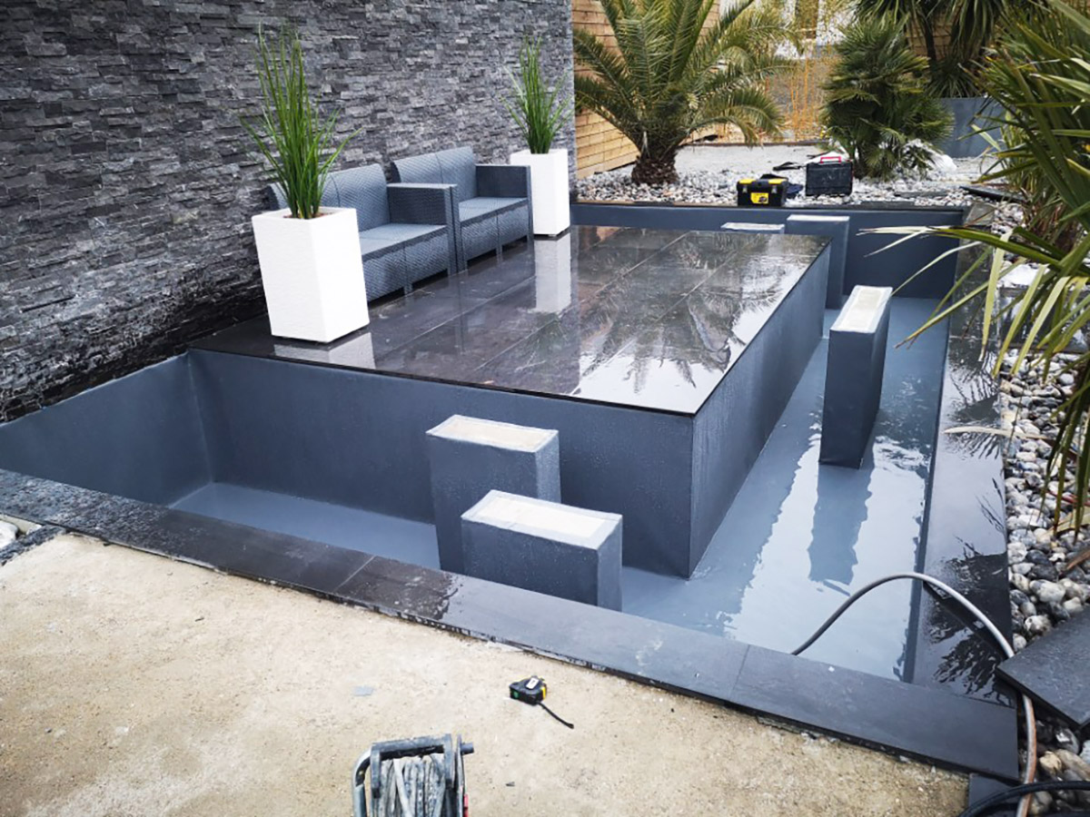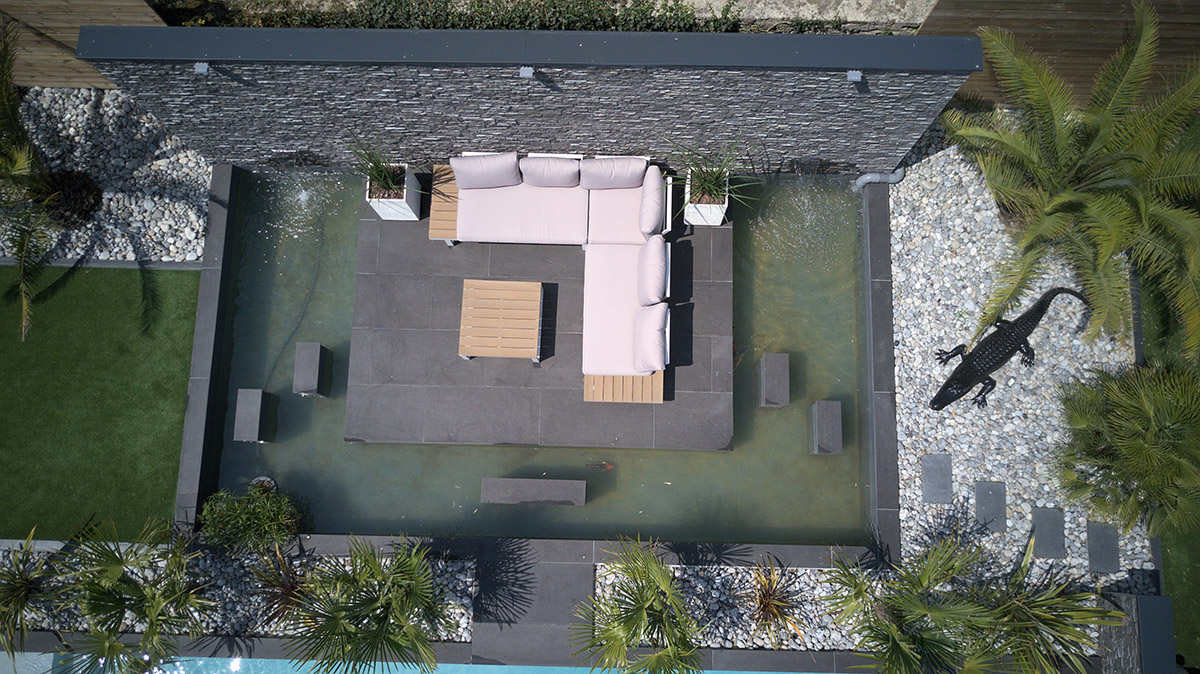 « C’est la première fois que nous réalisions un bac à poissons. Pour le traitement de son eau, nous avons fait appel à une entreprise de notre région spécialisée en aquaculture. En effet, ce bassin nécessite des produits et des équipements spécifiques. Nous avons installé et dissimulé des pompes et une lampe UV derrière le mur du bac. Côté étanchéité, nous n’avons pas posé de bâche noire EPDM standard. Nous avons privilégié un revêtement de qualité : une membrane armée aquatique qui permet de créer des angles vifs. Nous l’avons recouverte de carrelage et créé des colonnes dans le même matériau pour donner une cohérence esthétique. »