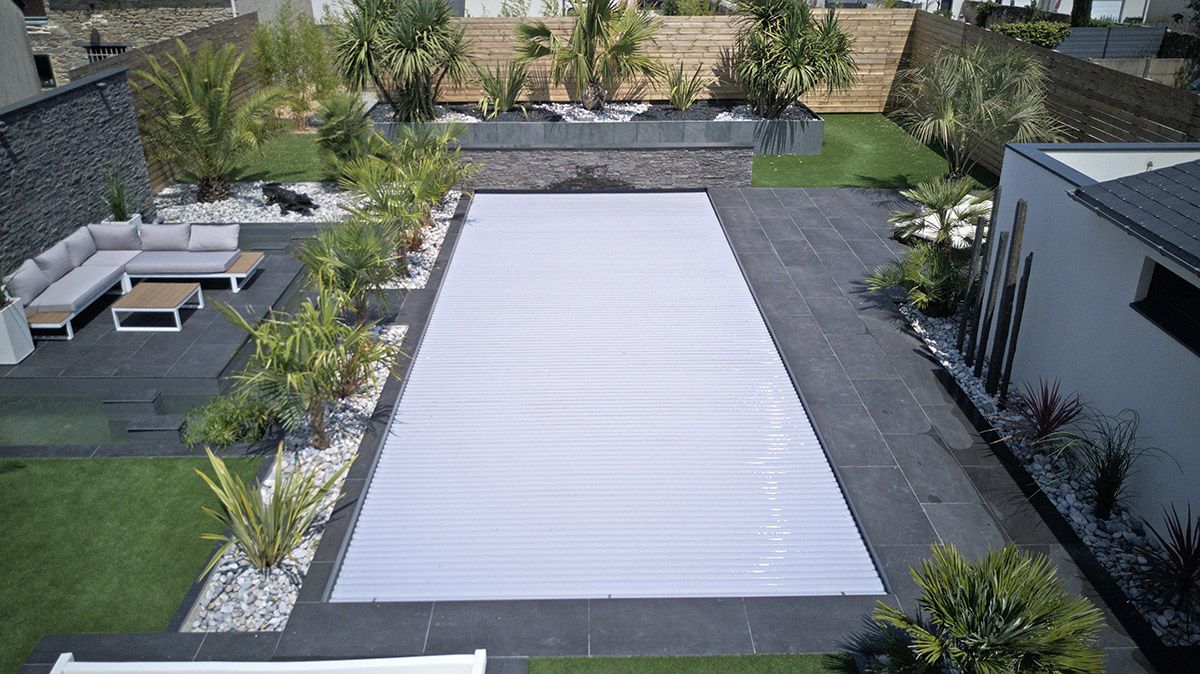 Nous avons ensuite monté le bassin en utilisant la structure Aquafeat. Une seule et même coulée a été réalisée pour l’ensemble des lieux de vie. Nous avons remblayé autour de tous les éléments. Un mur a été construit à une extrémité du bassin afin de dissimuler le volet automatique hors-sol. Deux poteaux ont été spécialement positionnés de chaque côté dans les fouilles. Le volet accueille une lame d’eau. Lorsqu’il se retire du bassin, la lame d’eau se met en route et quand il est déroulé, elle s’éteint instantanément. Les revêtements ont ensuite été posés en février/mars. »