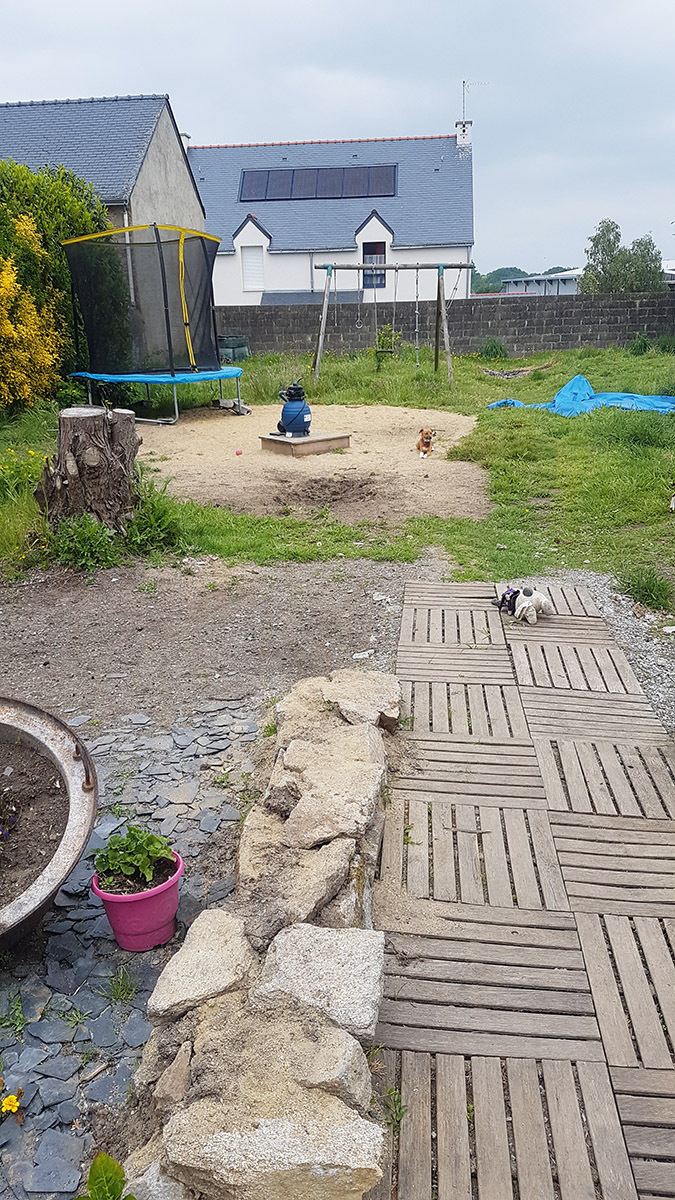 « Ce projet global d’aménagement comprend plusieurs espaces distincts qu’il nous a fallu penser et placer pour former un tout harmonieux. Ce chantier a duré trois mois. Pendant l’hiver 2020, nous avons creusé dans le même temps le bassin, un coin repas enterré carré de 3,50 m par 3,50 m et le bassin des poissons.
