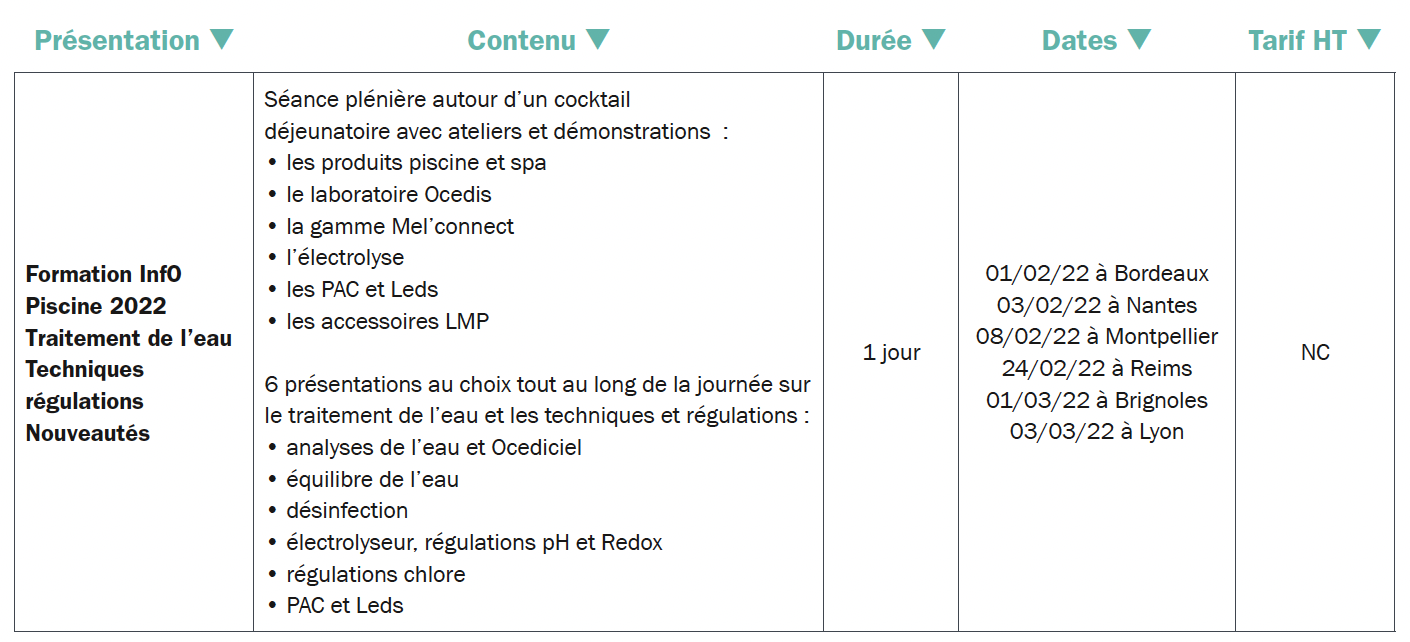 En 2022, Ocedis donne rendez-vous aux professionnels du secteur à l’occasion de ses formations InfO Piscine dédiées au traitement de l’eau, aux techniques de régulations et à ses nouveautés. Les participants pourront dans 6 villes de France, assister à des ateliers, démonstrations et présentations ciblées sur des produits et thématiques de leur quotidien.