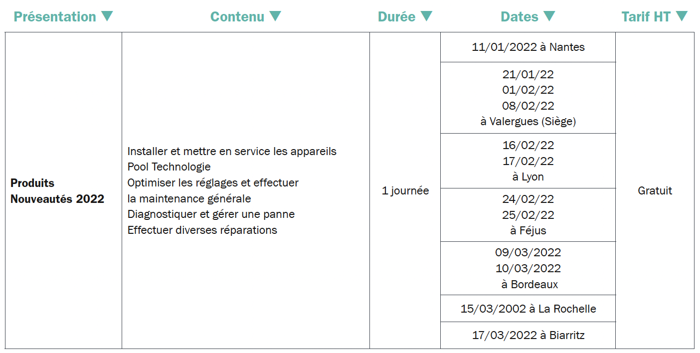 Pool Technologie présente son calendrier de formations 2021/2022 dédiées à l’installation et à la mise en service de ses appareils, à l’optimisation des réglages, à la maintenance générale, au diagnostic et à la gestion d’une panne, etc.