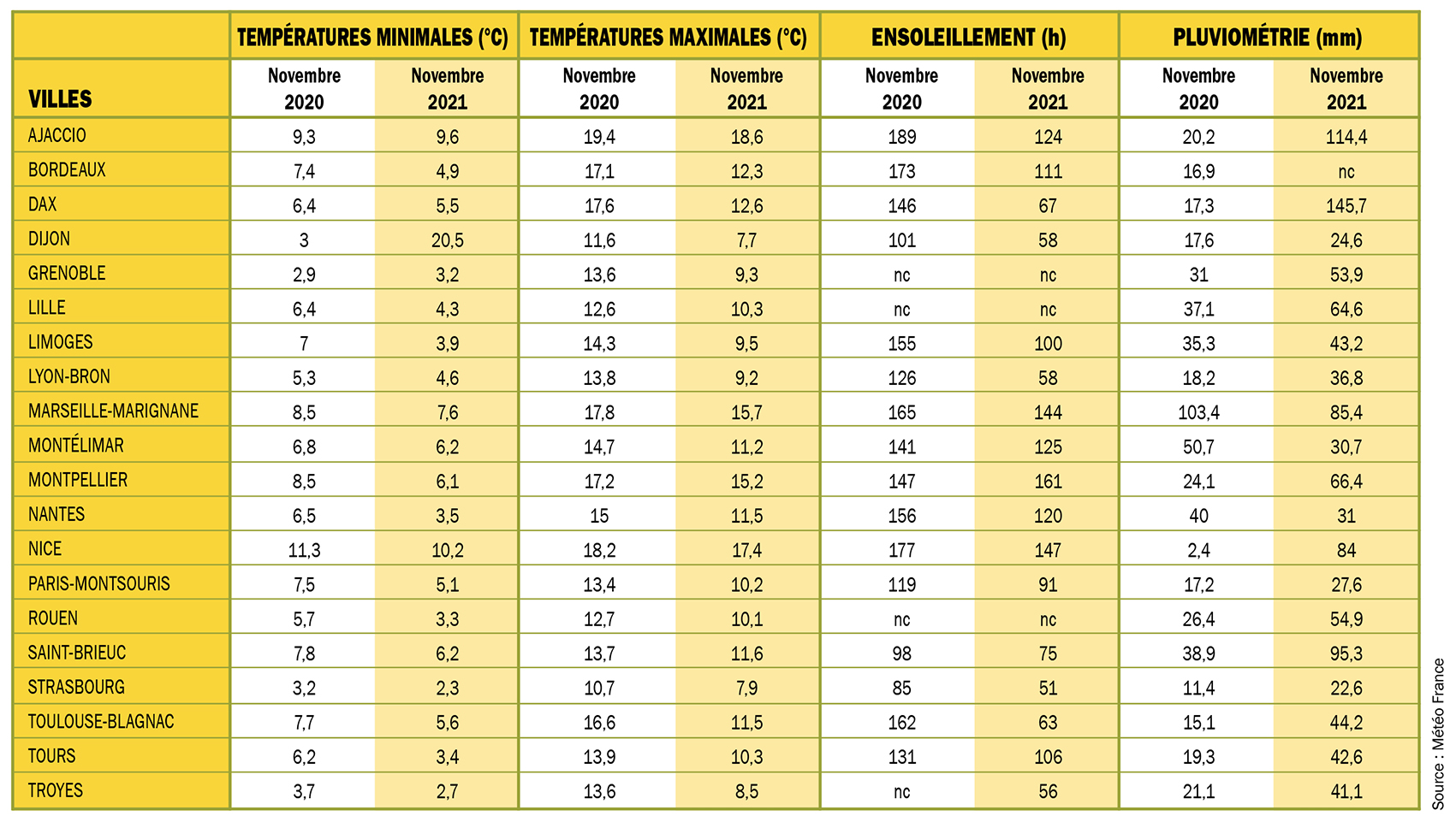 Inférieure à la normale de 0.7 °C, la température moyenne était de 7.9 °C sur la France et sur le mois. Les précipitations, excédentaires sur l’extrême nord du pays, du sud de l’Occitanie au littoral varois et en Corse, ont été déficitaires de 20 à 70 % sur le reste de l’Hexagone. Ce déficit pluviométrique a dépassé 30 % en moyenne sur la France et sur le mois.