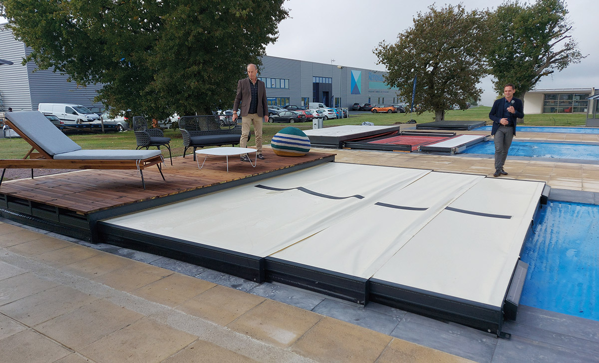 Entouré de ses équipes R&D et industrielles, Olivier Dixneuf (Directeur Général) a accueilli les participants et est revenu sur l’histoire et l’actualité de l’entreprise. Avec cette couverture, Rénoval Abris veut proposer une solution différenciante prête à poser, à l’image d’une véranda. Martin Héraud, responsable innovation R&D du groupe, a ensuite relaté l’histoire de la création de cette innovation, débutée en janvier 2020. Ce projet est né de deux constats, un positionnement hybride possible entre le volet et l’abri, et une stagnation des chiffres de vente : 85 % des piscines sont équipées d’un volet ou d’une bâche, 15 % d’un abri.  L’idée était donc de réunir tous les avantages de l’un et de l’autre.