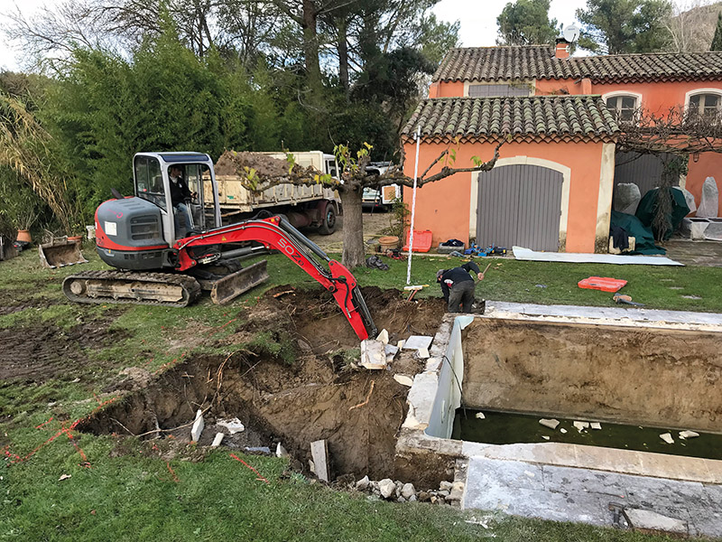 « Une réunion de chantier avait été organisée avec le maçon et le terrassier au cours de laquelle, nous avions défini, délimité et tracé la zone d’action sur le sol pour poser les bases afin que chacun sache ce qu’il avait à faire. Le terrassement et l’évacuation de la terre pouvaient alors commencer. Sauf à effectuer une étude de sol onéreuse, nous ne pouvions pas deviner ce que nous allions trouver. Sur le devis, j’avais formulé un minimum de réserves. En effet, je me doutais qu’il y aurait de l’eau car nous avions rencontré ce problème 20 ans auparavant lorsque nous avions construit la piscine du voisin. Ce terrain est situé au pied des Alpilles, en direction de la route des Baux-de-Provence. En creusant l’extension à ras du mur, nous avons découvert de l’eau de ruissellement. Ce fut la seule déconvenue rencontrée, solutionnée grâce à un système de drainage et de pompage. »