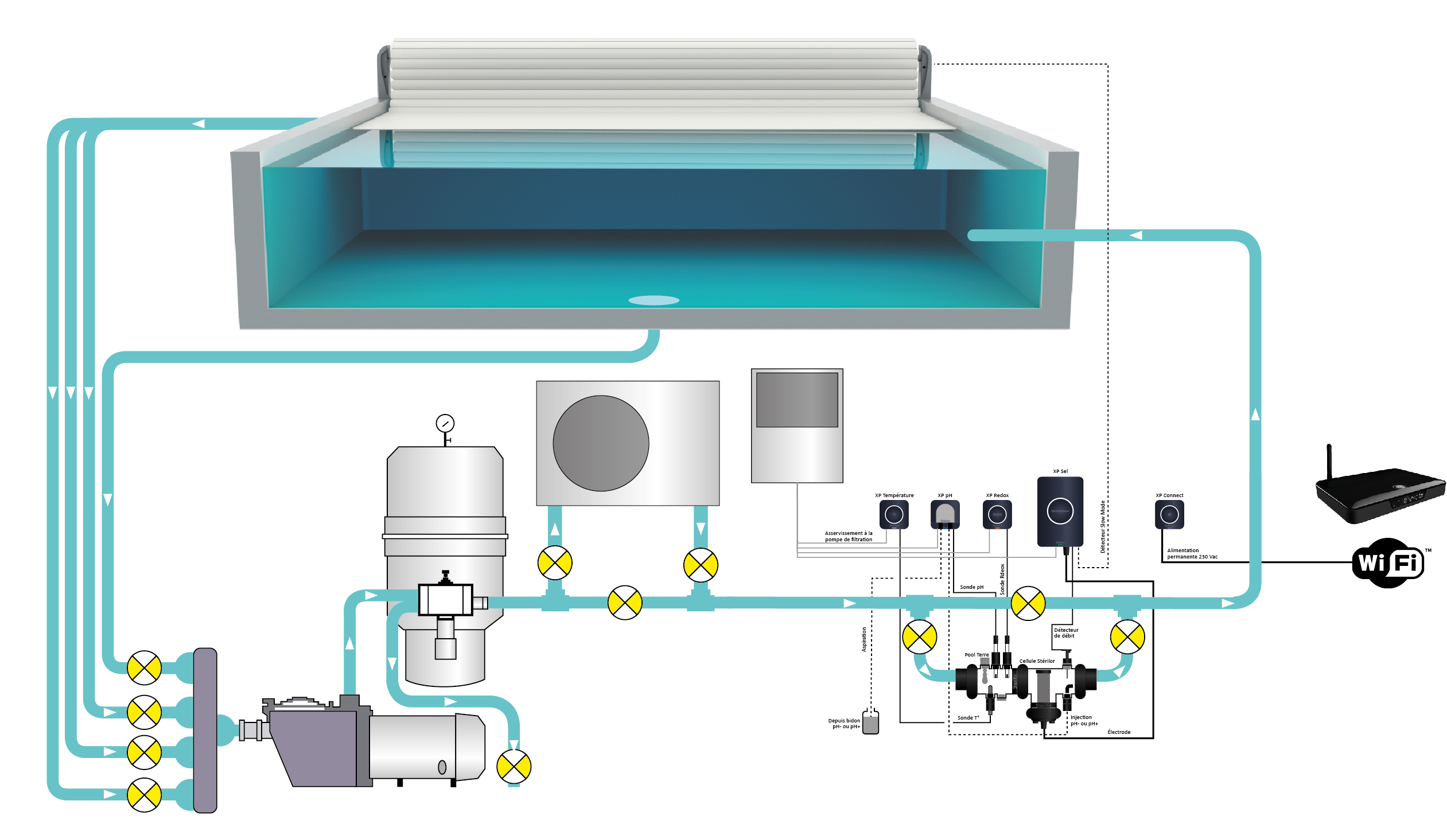- Connexion à distance en Wi-Fi pour visualiser les paramètres de l’eau, agir sur les réglages du traitement, afficher l’historique de fonctionnement des appareils, permettre l’intervention à distance du piscinier avec délégation sécurisée. Un doute sur la qualité de réception du WIFI dans le local technique ? L’application permet, lors de l’appairage du Module Connect, de tester cette qualité et de proposer, si besoin, une solution d’amplification du signal Wi-Fi du client (CPL, répéteur, routeur, antenne).