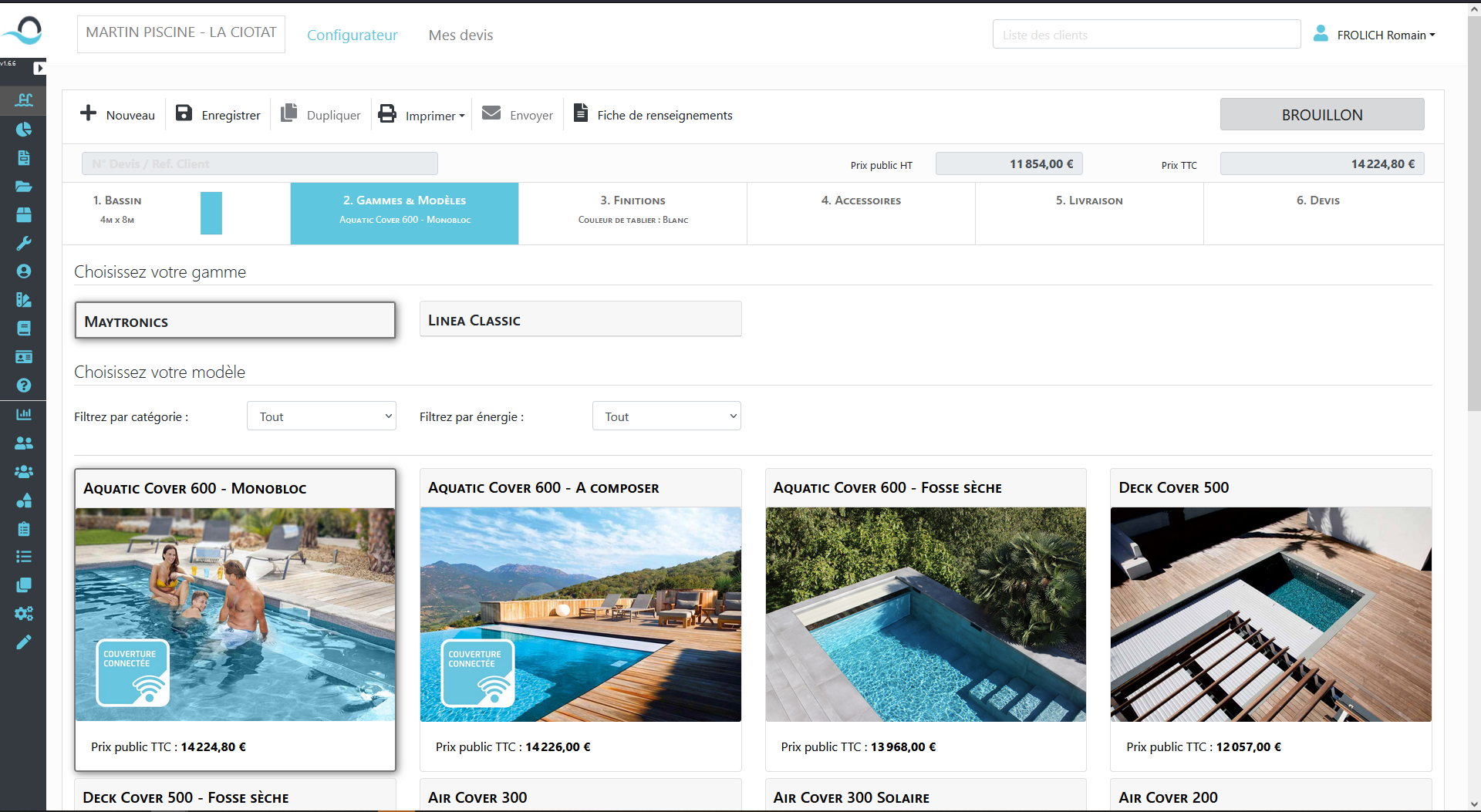 Le configurateur de volet fait partie des outils d’avant-vente que nous proposons. Cet outil digital, intuitif et ergonomique, permet au piscinier de faire une cotation devis en quelques minutes et de répondre parfaitement au besoin de son client. Créé il y a 8 ans, l’outil a été complètement revu. Il suffit de préciser le type de bassin, sa forme, ses dimensions, le type de couverture (hors sol ou immergé), les obstacles (échelle, ilot…), la présence d’un débordement, le type de revêtement, etc… On va très loin, avec toutes les configurations possibles et imaginables. Une fois choisi le type de couverture, on passe à l’étape du choix de la personnalisation et des finitions, en s’appuyant sur la mallette de présentation, un autre de nos outils. Elle présente finalement tout ce qui est visible par le client : types de lames proposés, couleurs disponibles pour le tablier et les plots choix d’attaches…